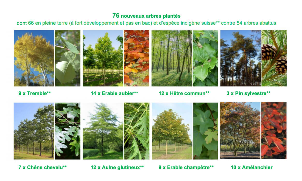 Pour information, le Populus tremula, l’Acer opalus, le Fagus sylvatica, le Pinus sylvestris, l’Alnus glutinosa et l’Acer campestre sont des espèces naturelles très fréquentes sur le plateau suisse selon le répertoire d’Info Flora (voir carte de distribution de la flore, Centre national de données et d’informations sur la flore de Suisse, www.infoflora.ch)